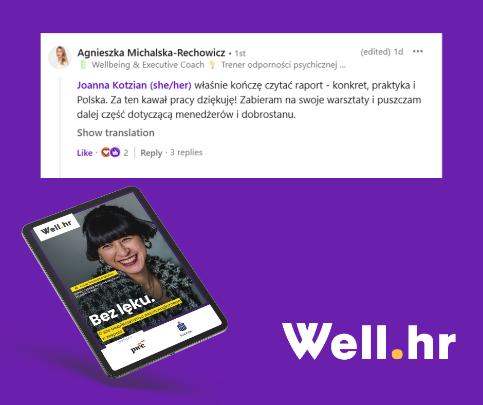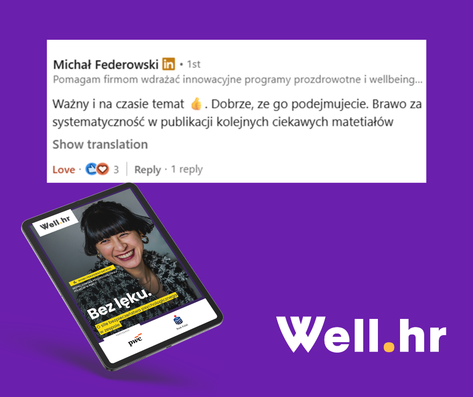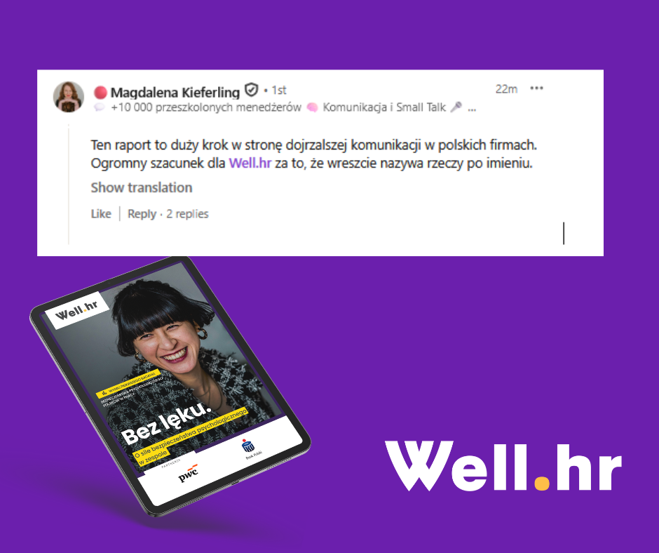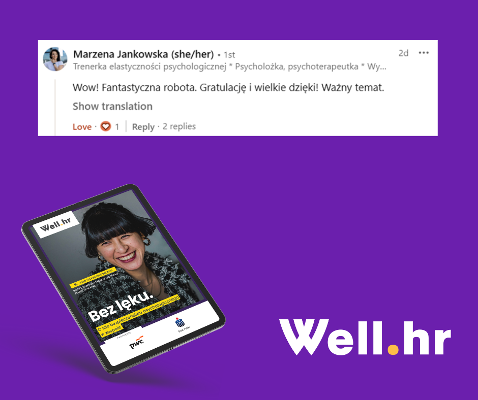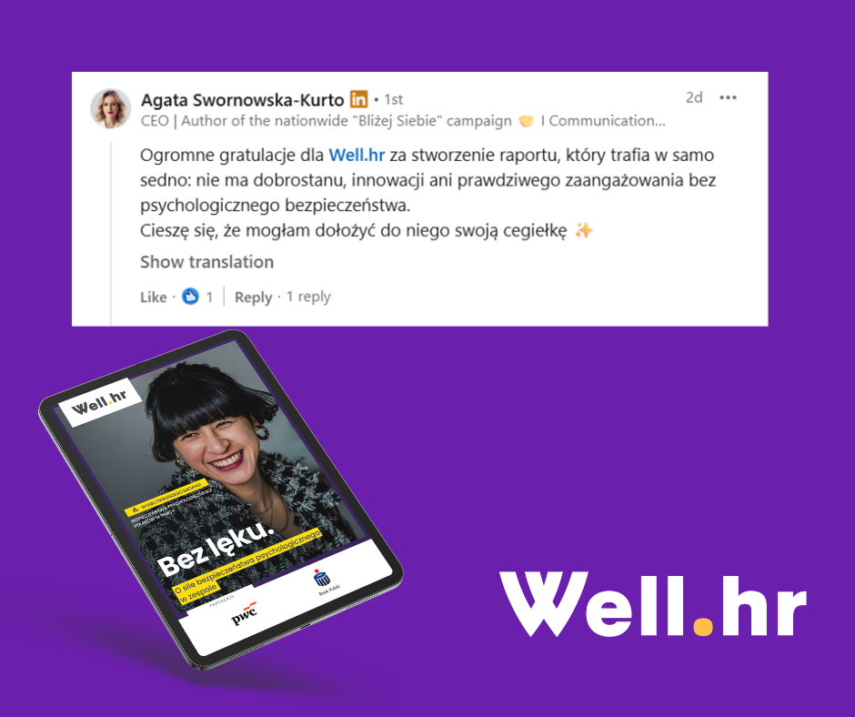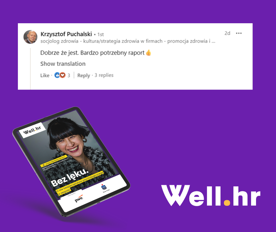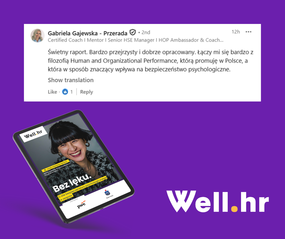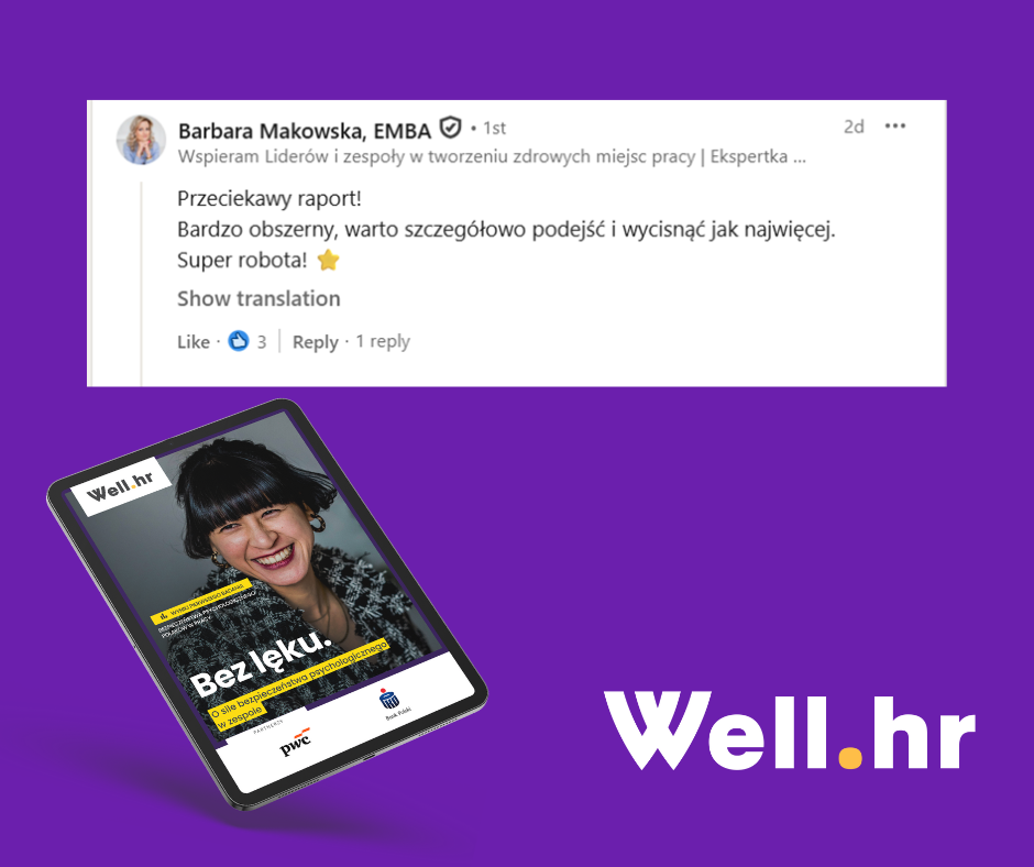 Z najnowszego raportu Well.hr dowiecie się m.in.: jakie rodzaje ryzyka jest nam w pracy podejmować najtrudniej, jak wygląda poziom bezpieczeństwa różnych grup pracowników, jaka jest sytuacja zawodowa osób z niskim i wysokim poziomem bezpieczeństwa psychologicznego oraz, co na tym może zyskać lub stracić ich pracodawca.